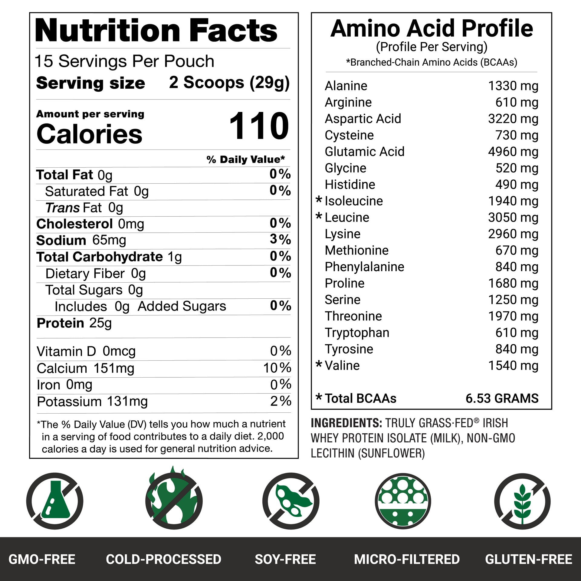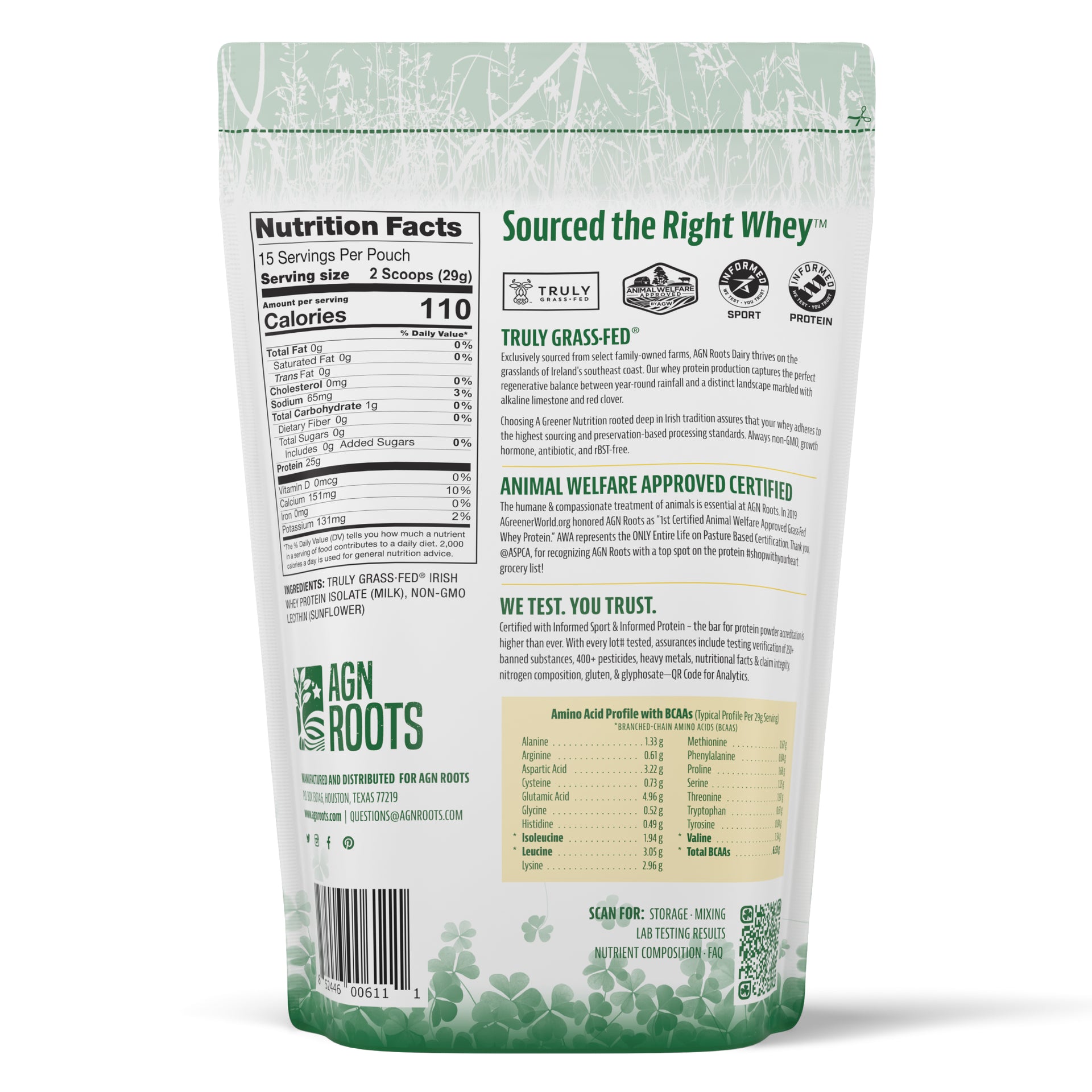 The methods and techniques selected make possible the high-density micro-nutrients (vitamins & minerals), branched-chain amino acids (BCAAs), and nitrogenous macro-nutrients endemic to 100% farm fed cows in every serving of AGN Roots Grass Fed Whey Isolate.
